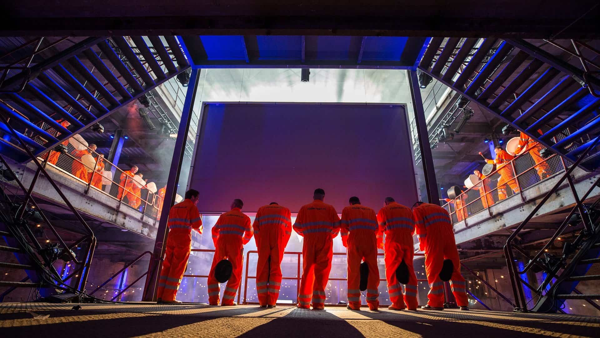 Industriële setting bij SugarFactory met mensen in oranje werkpakken.