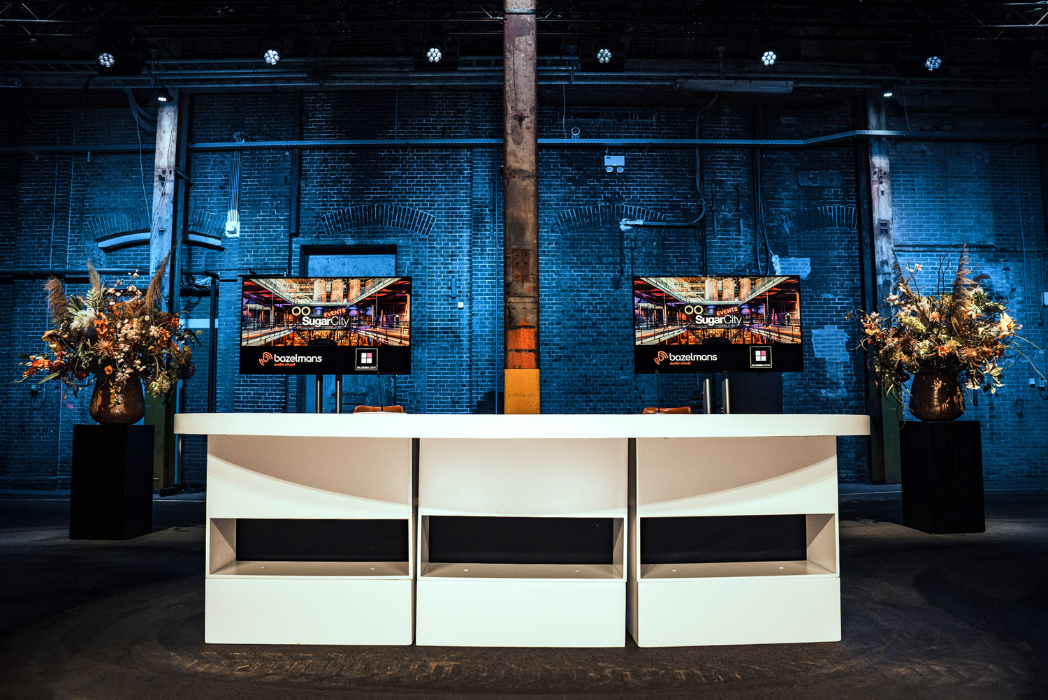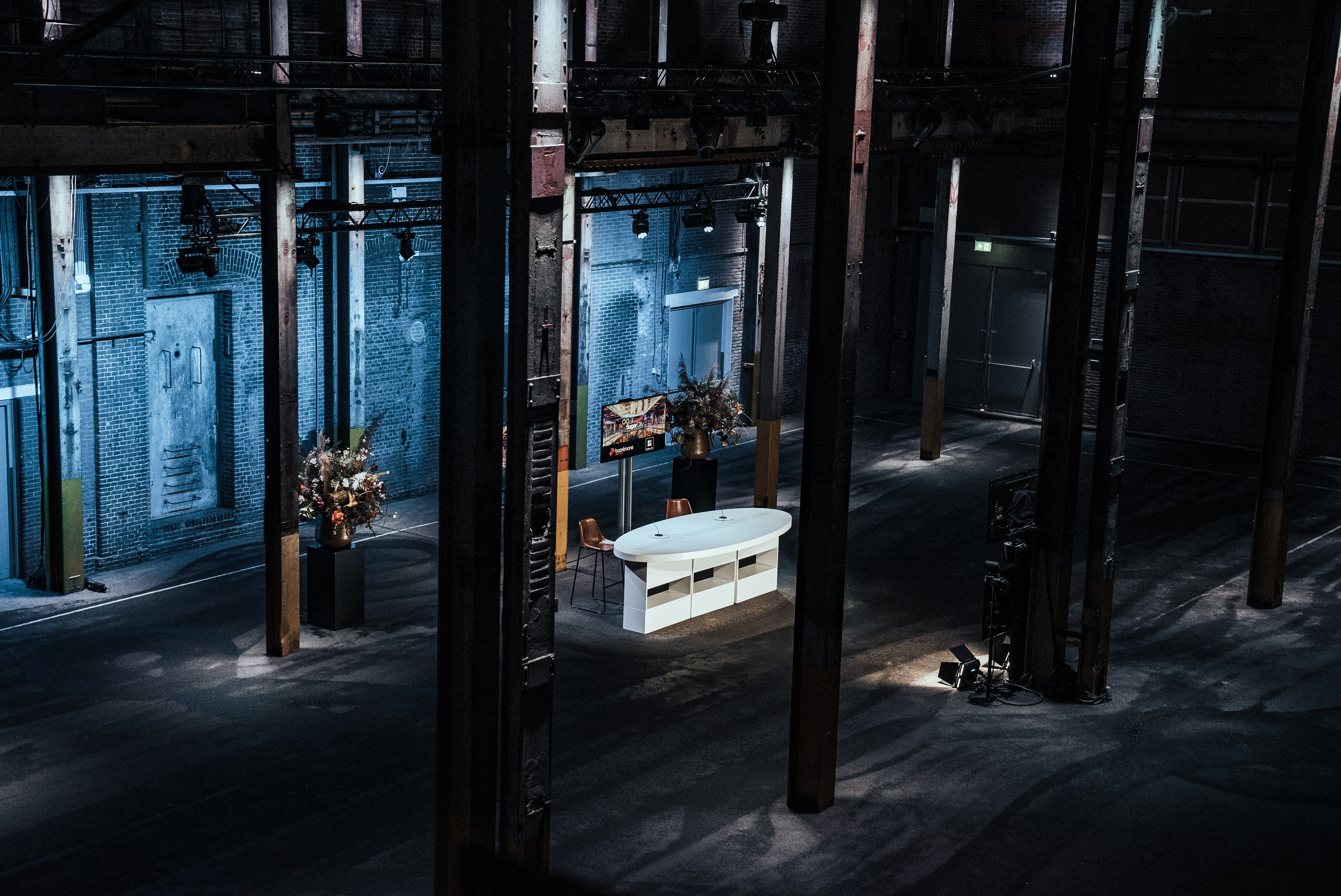 In SugarFactory’ large Pulppersloods, unique by its dizzying height and industrial pillars, professional livestreams, webcasts and interactive video productions can now be realised. Ideal for product launches or important conferences, when clients want to leave a professional impression. Denise Schimmel of SugarFactory: ”We received many positive responses after our ‘1.5 metre events’ article. By facilitating a professional webcast studio, we are now concretely responding to new opportunities. Thanks to our collaboration with Bazelmans AV and BloemBloem, we can continue to guarantee the high quality that people have come to expect from us”.
